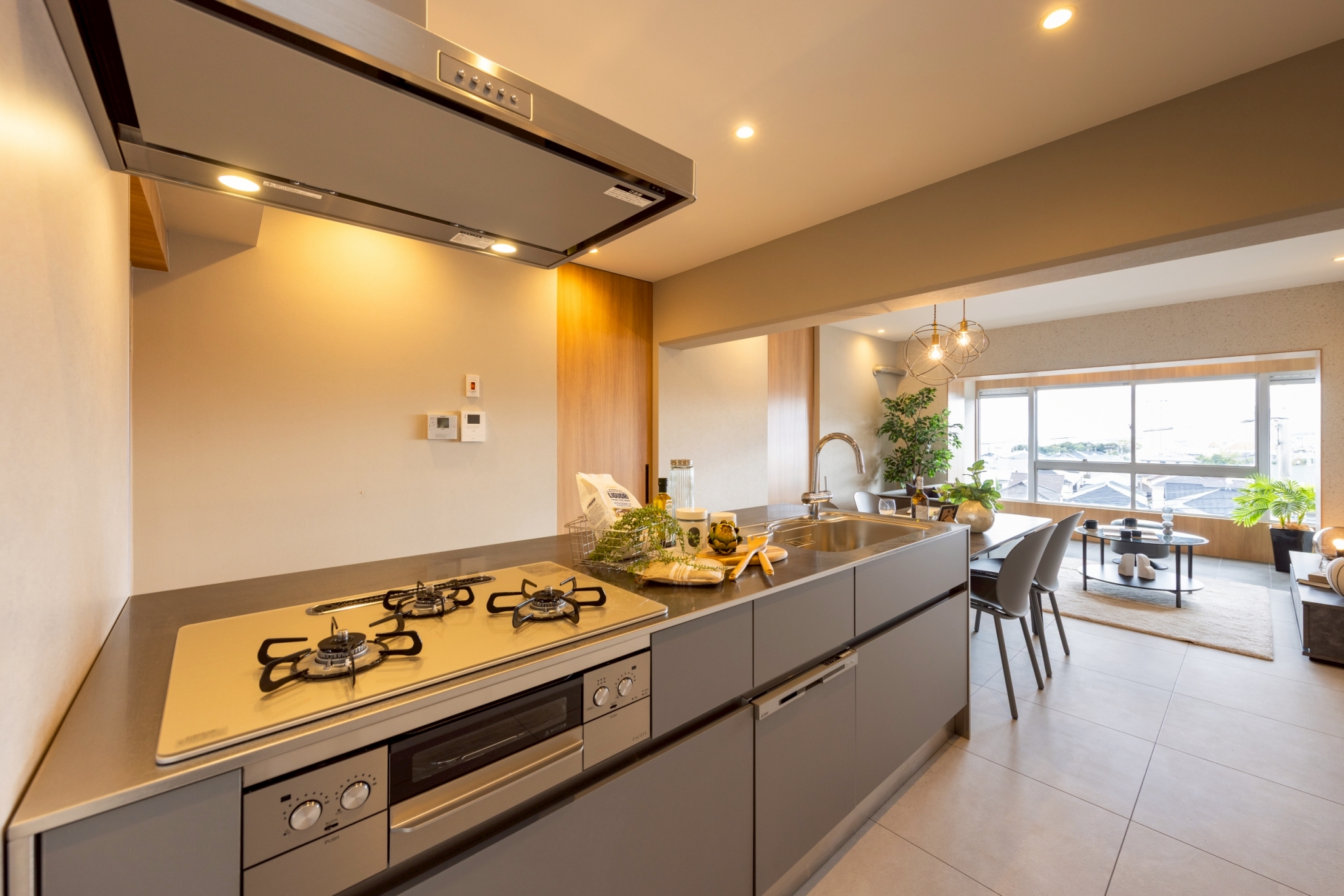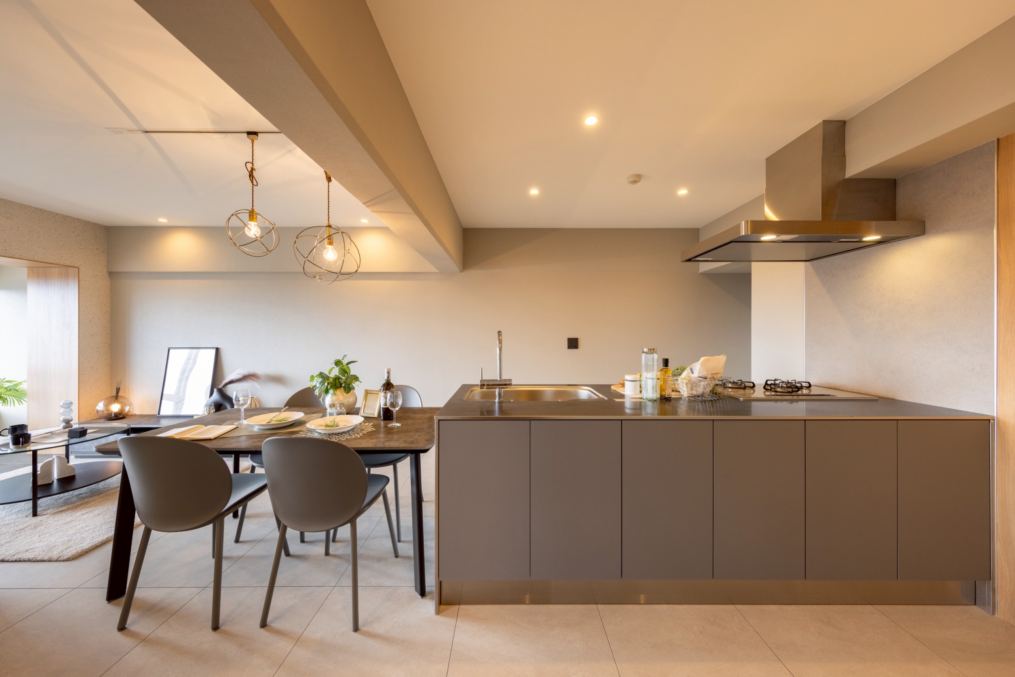 約22帖のゆとりあるリビング・ダイニング・キッチンが住戸の中心となっています。デザインゲートが生み出す奥行きある構図と、インナーテラスがもたらす開放感。正面に広がるダイレクトウィンドウからは、宝塚の街並みと遠景の山々を一望できます。外の景色を暮らしの一部に取り込みながら穏やかで上質な時間を過ごせるリビングです。
