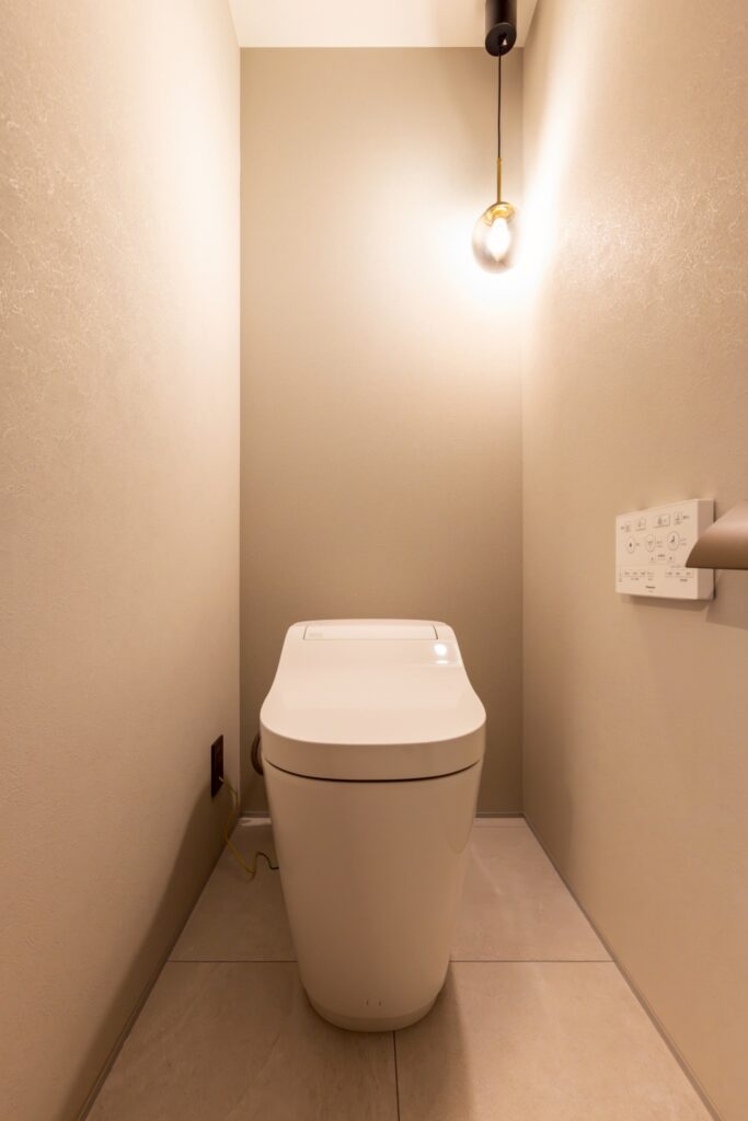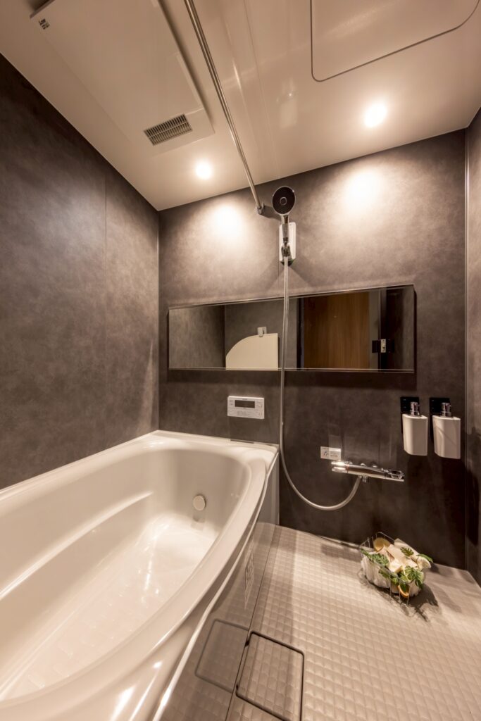 浴室は全面ダークグレー柄の壁とダウンライトの採用で落ち着いた空間に。暖房乾燥機や追炊き機能も完備し、棚やシャワーフックをすべてマグネット仕様にすることで掃除なども容易にできる仕様です。トイレにはタンクレス便器、ペンダントライトを設置することで寛ぎの空間となっています。