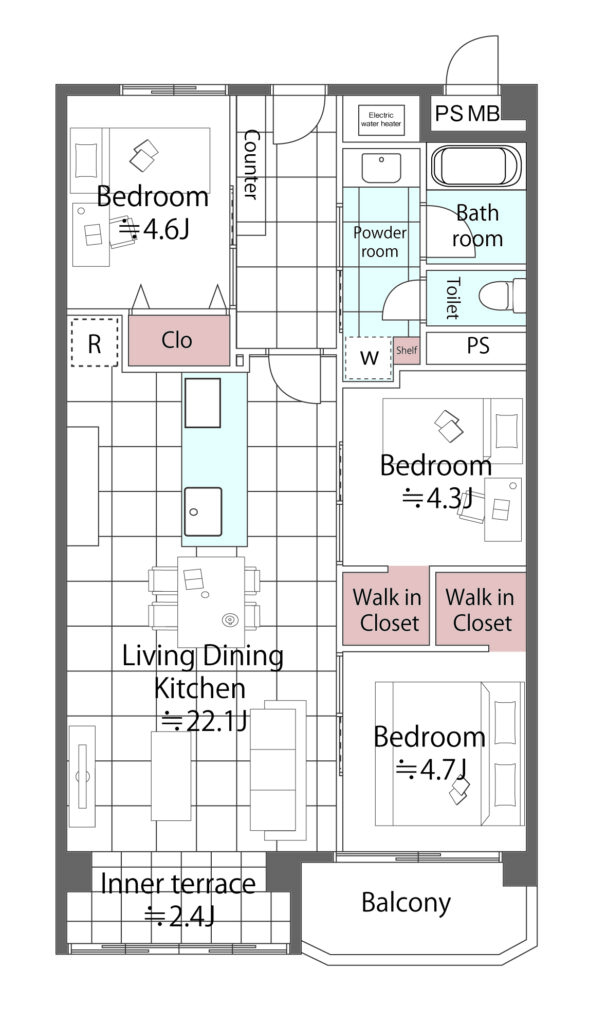 約70㎡のゆとりある3LDK 。眺望に優れたインナーテラスを配する明るく開放的なLDKを中心とした間取です。