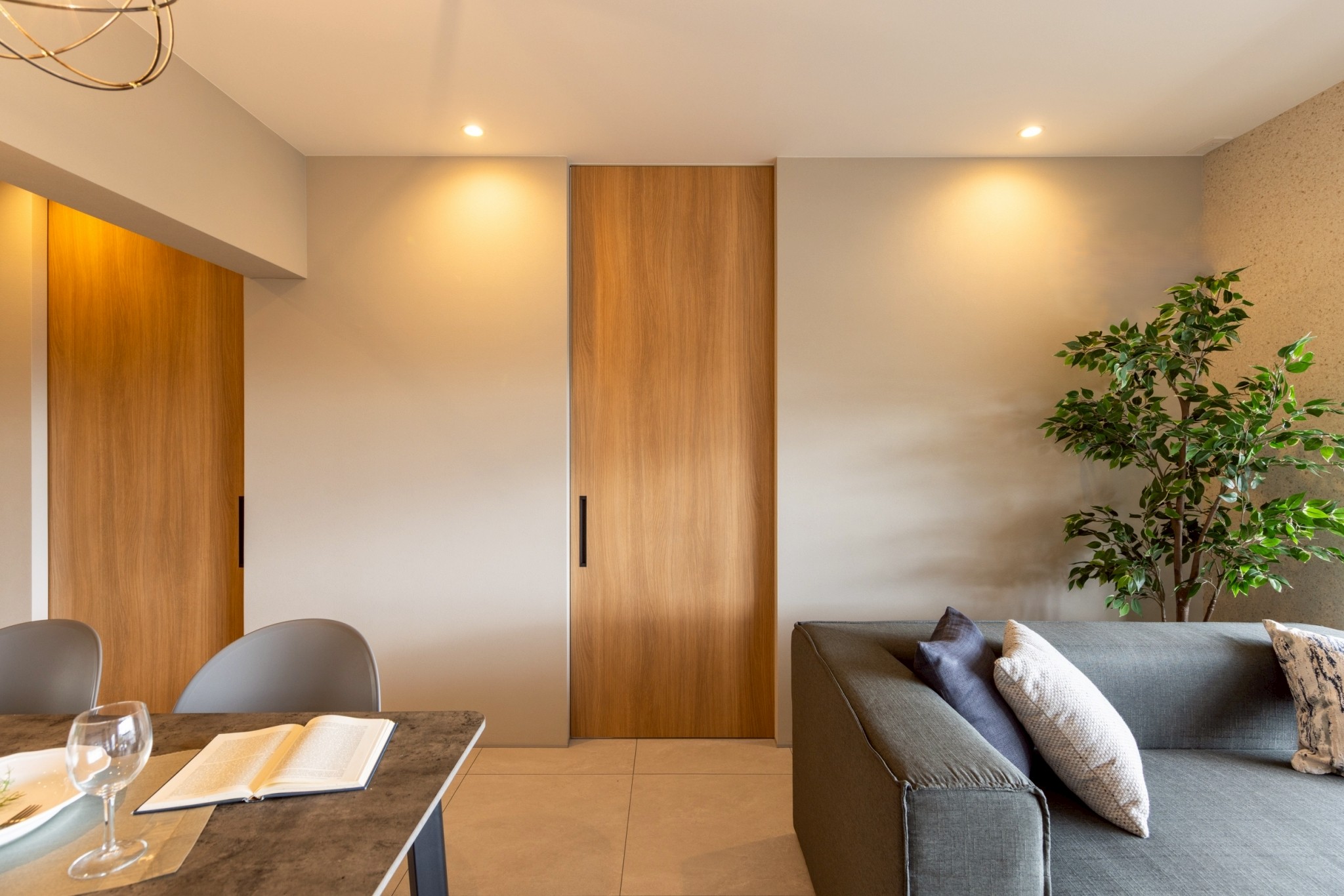 室内建具には天井まであり枠のないハイドアを採用。空間の広がりや高級感を演出しています。