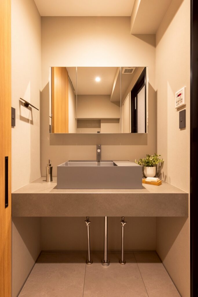 洗面室にも上質感にこだわった造作洗面カウンター、洗面ボウルと3面鏡を採用しました。壁付け設置で浮遊感も得られ、存在感がありながらも重厚になりすぎないデザインです。