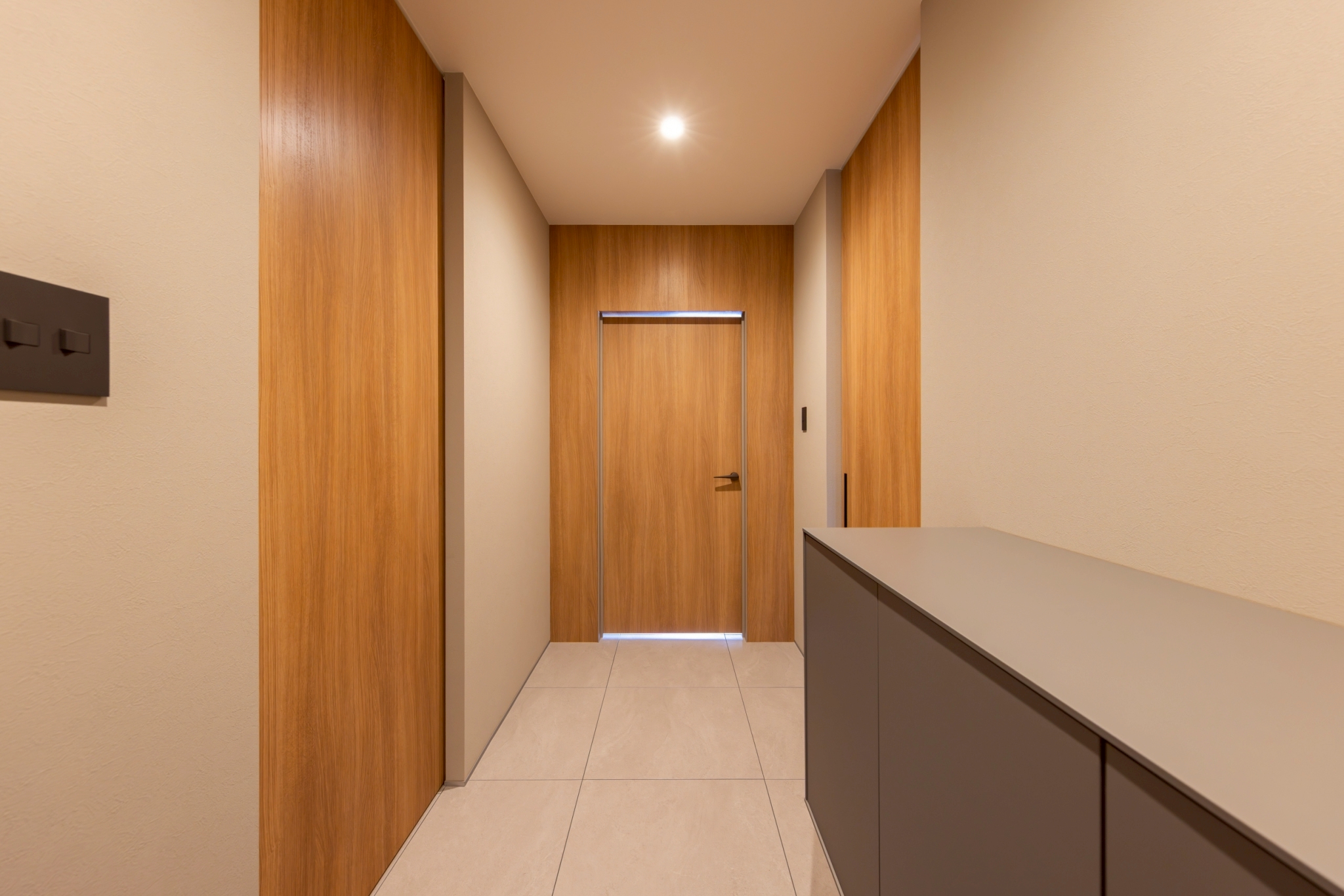 玄関・廊下からリビングまで石目柄のフロアタイルを全面に施工。狭くなりがちなマンションの玄関・廊下を本件ではゆったりと設計しました。また、フロート型の下足入や廊下収納も設置し、収納量にも配慮しました。