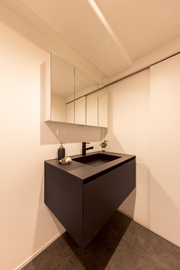 ゆったりとした洗面室には黒の重厚なスチールやステンレスを素材としながらも、天板や側板を極限まで薄くしたスタイリッシュな洗面台と3面鏡を採用しました。洗面台収納は手を掛けて引き出すスライドタイプで、洗面小物などがたっぷり入り、奥の物も簡単に取り出せます。