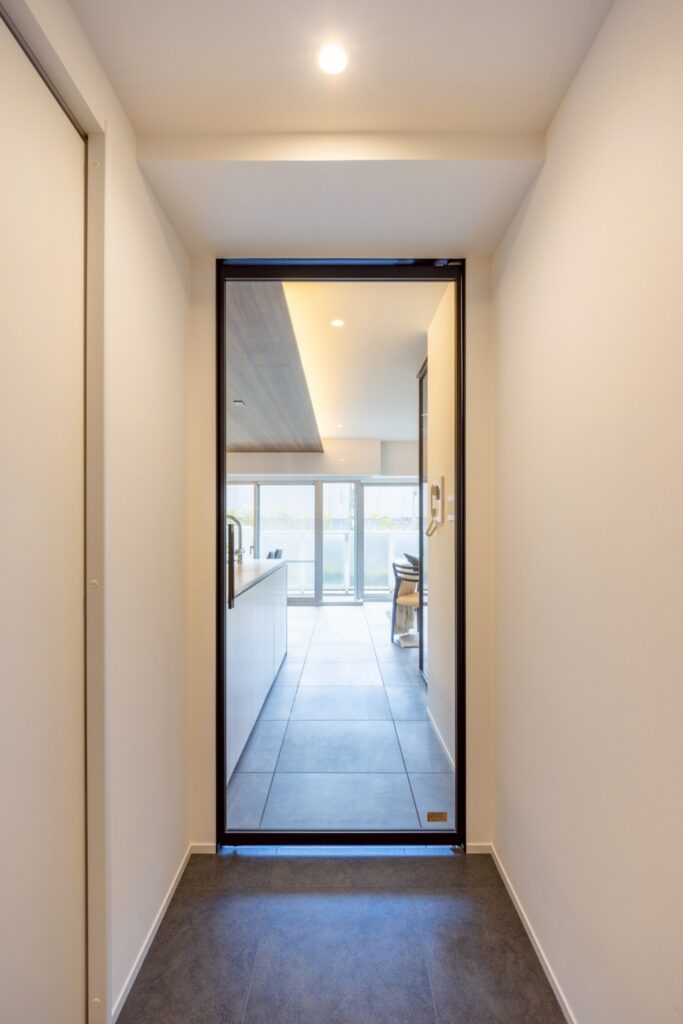 リビングドアには空間につながりを生み出すガラスドアを採用しました。リビングドアから光を導き、人を迎える空間を演出しています。