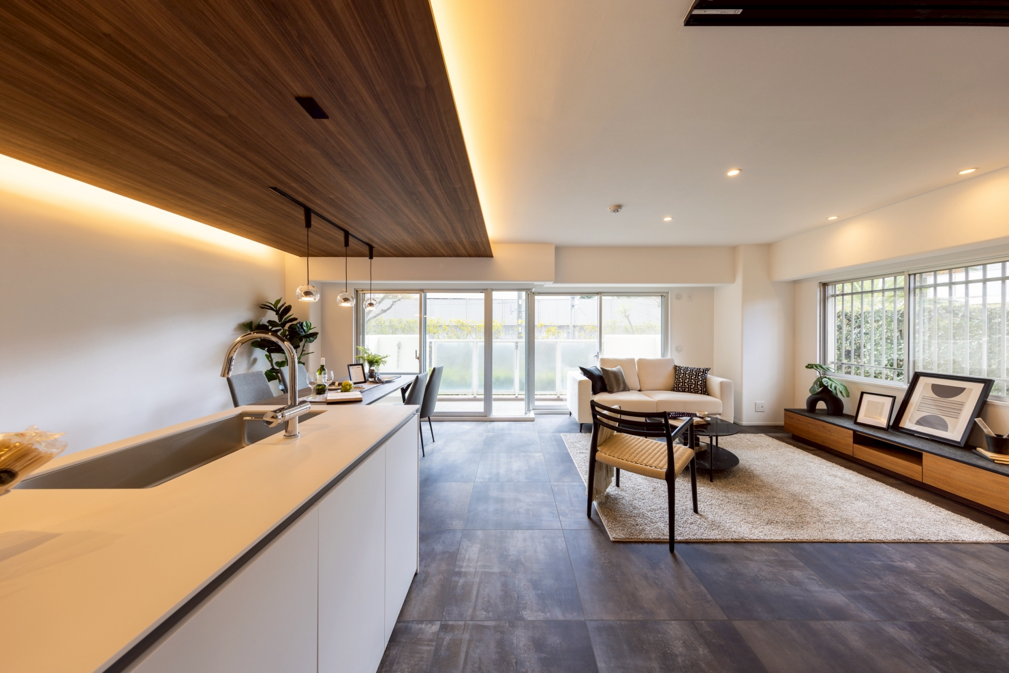 約20帖のゆとりあるリビング・ダイニング・キッチンが住戸の中心となっています。南向きのバルコニーからは明るい陽光が差し込み、間接照明などとともにくつろぎの空間を実現しました。