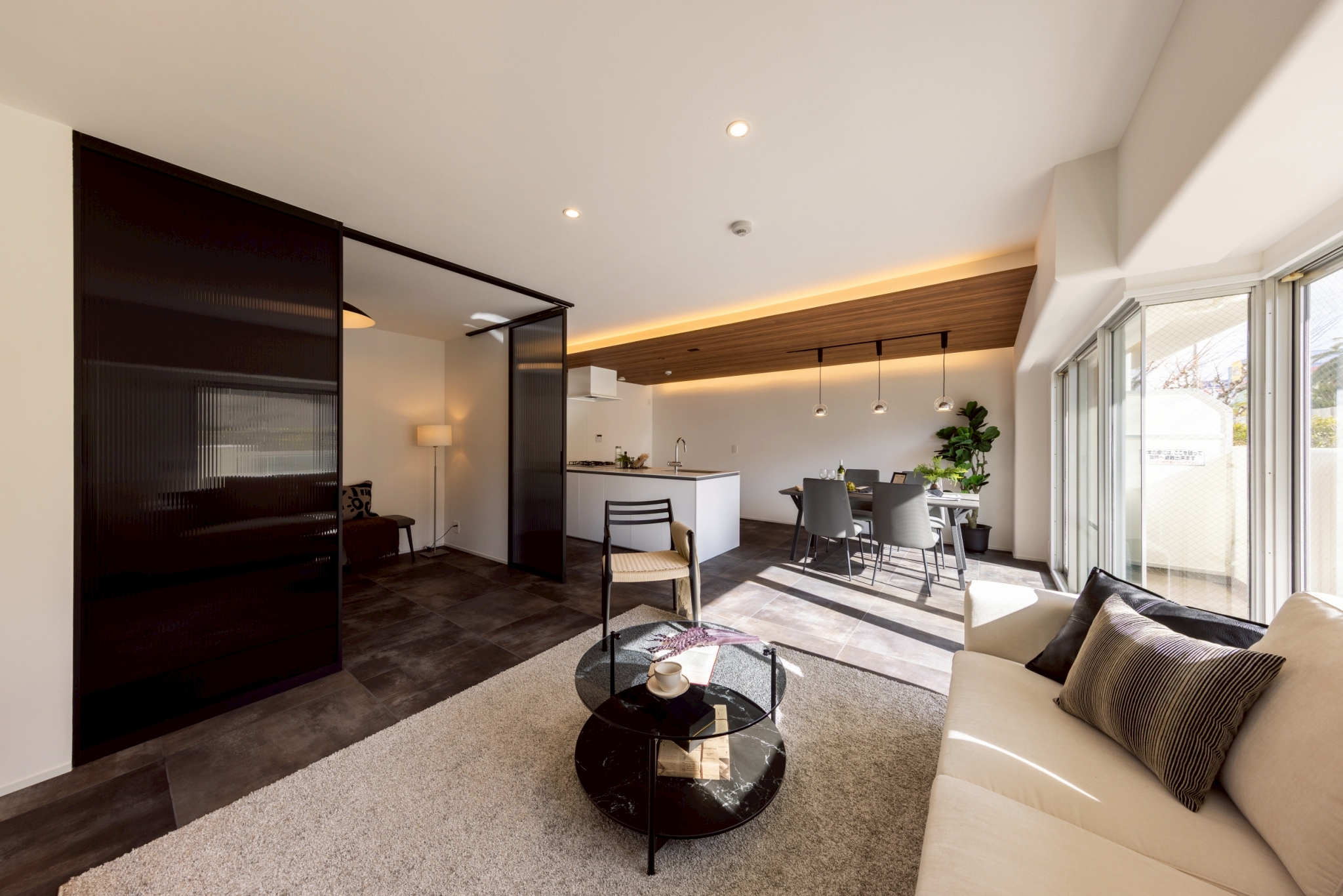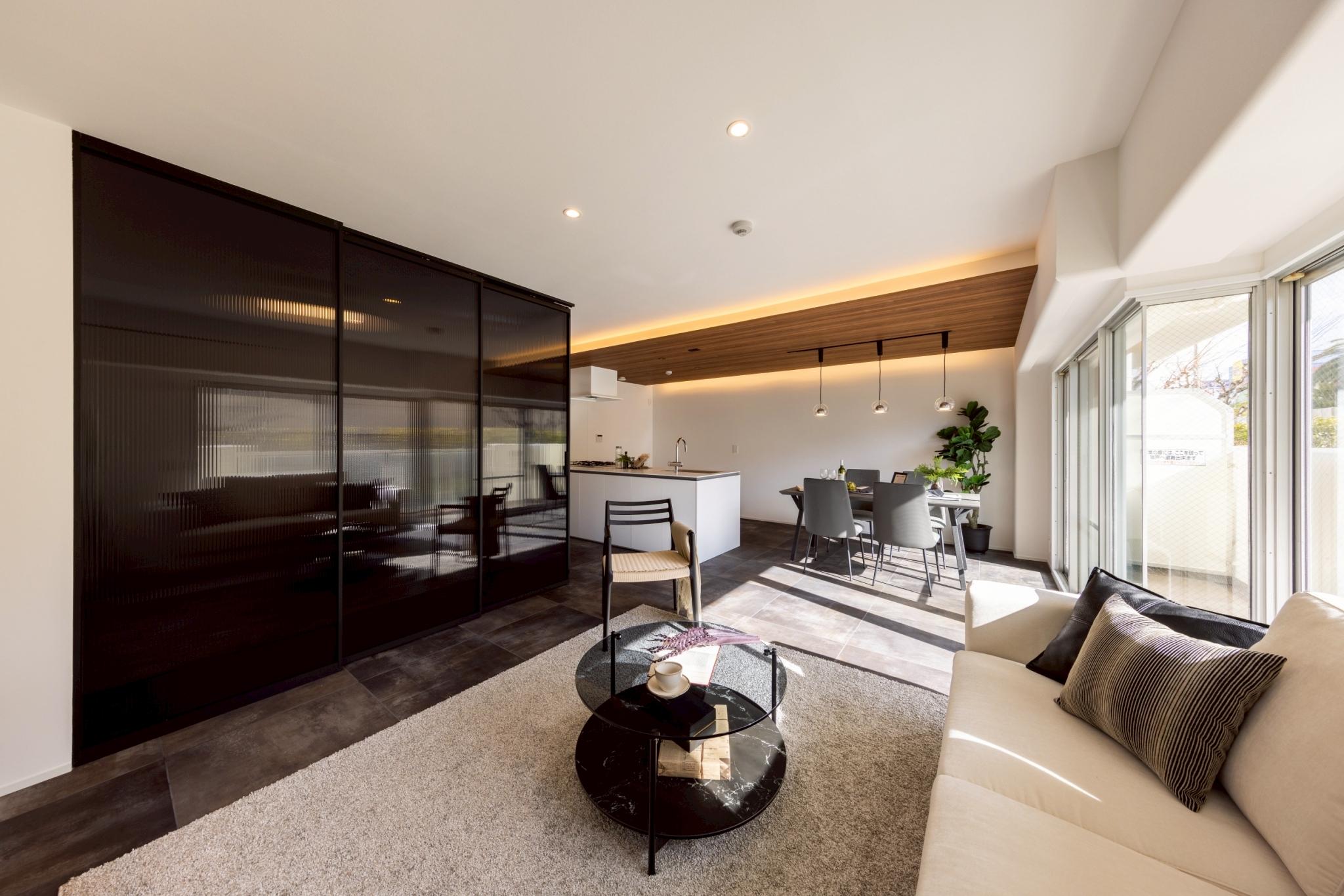 またリビング横の洋室にはブラックの大開口ガラス引戸を採用し、プライベートルームとしても、リビングとの一体空間としての利用も可能です。