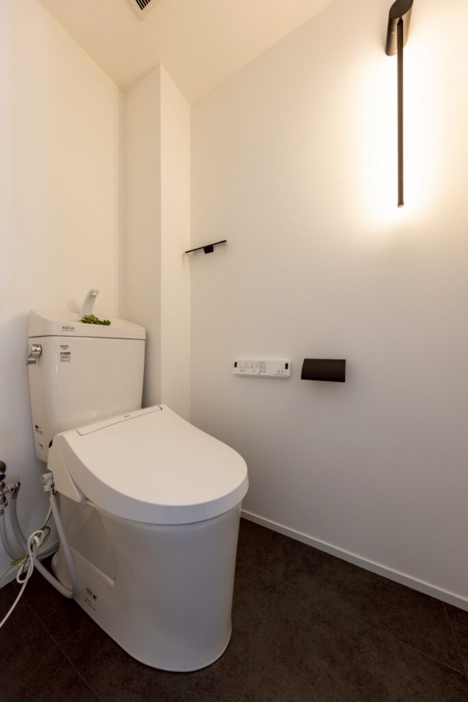 浴室は光沢のある白壁とダウンライトの採用で明るくも落ち着いた空間に。暖房乾燥機や追炊き(高温差湯機能)も完備し、棚やシャワーフックをすべてマグネット仕様にすることで掃除なども容易にできる仕様です。