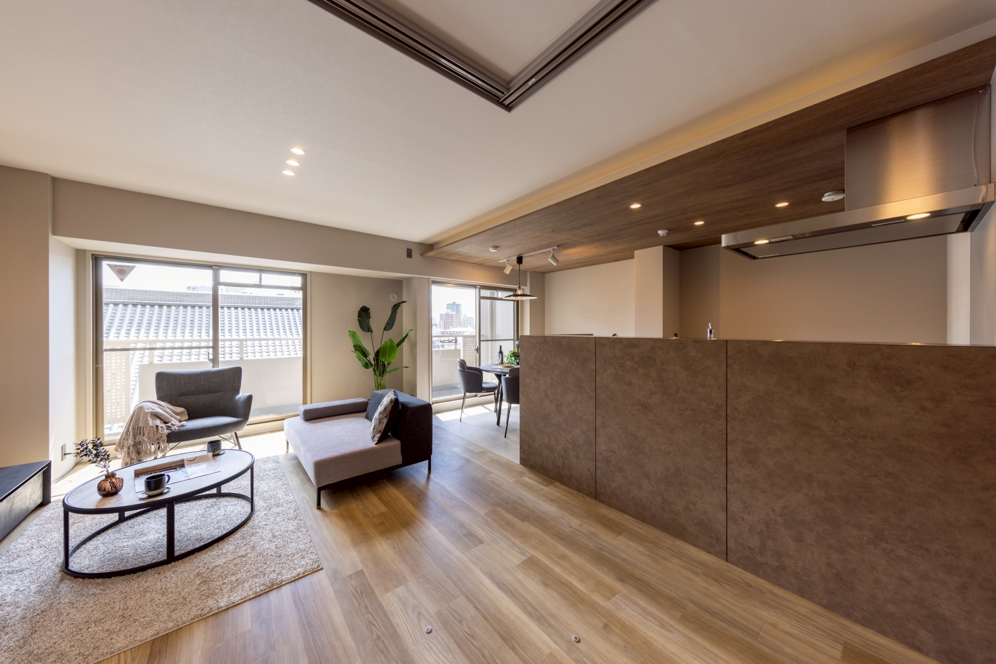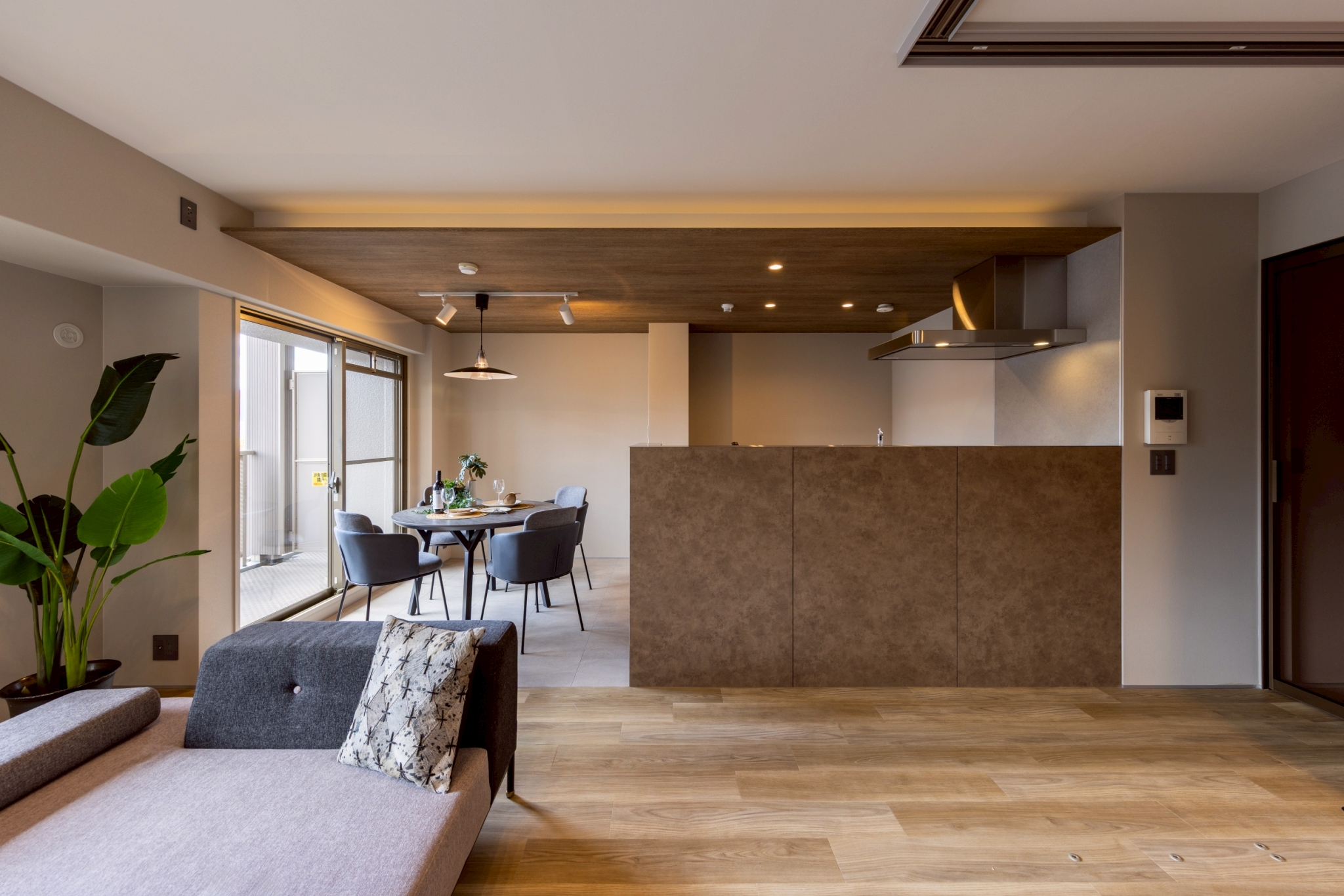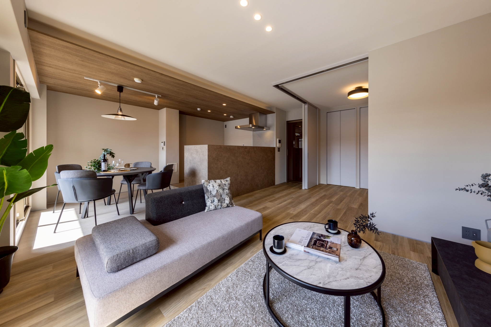 キッチン上部は木目の意匠で温かみを演出。引戸で仕切れる洋室は開放すれば一体感のある空間となり、ライフスタイルに合わせて多彩に活用できます。