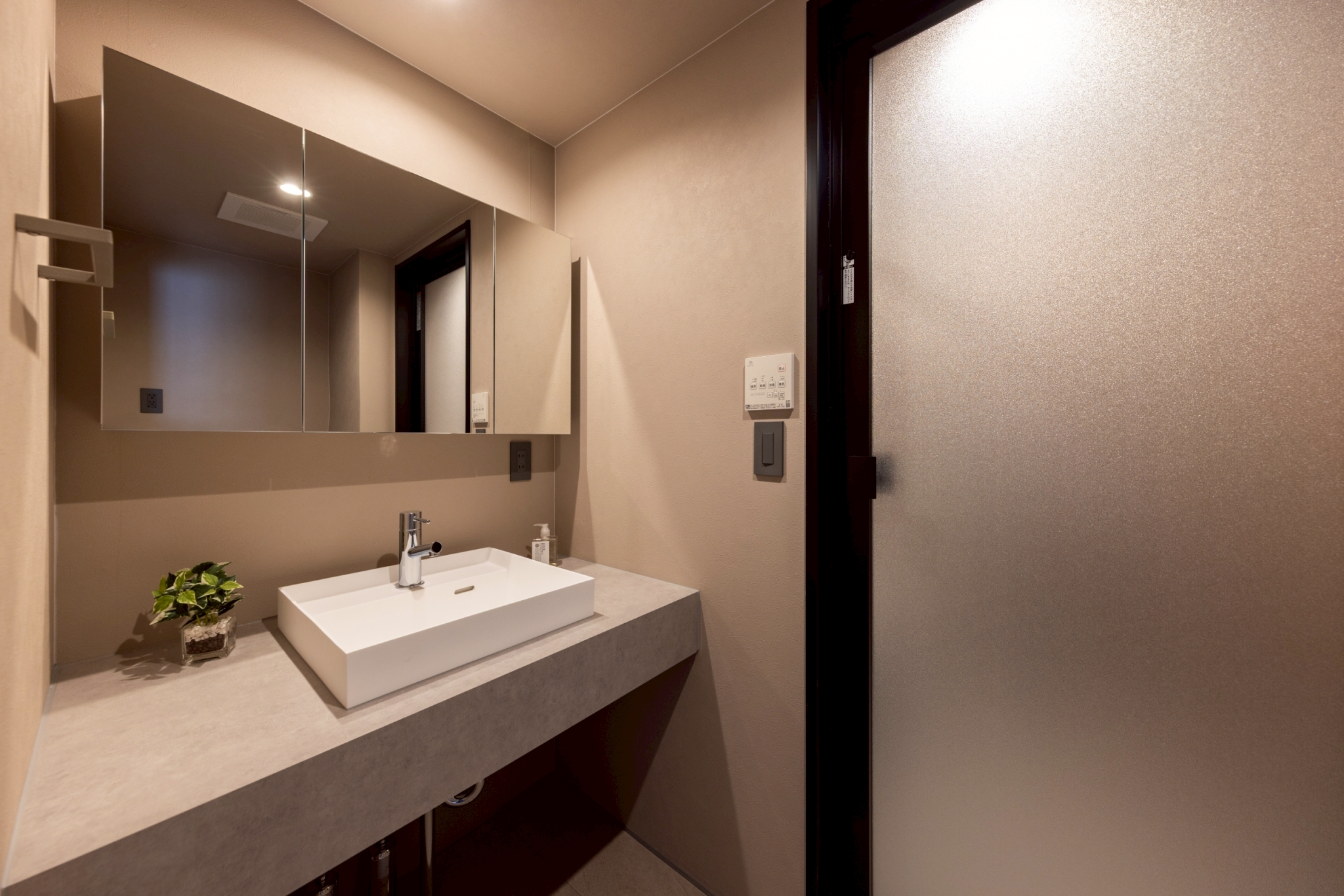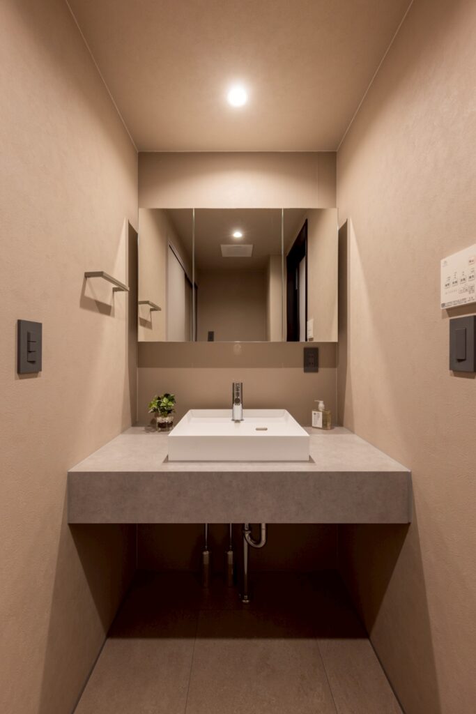 全体のデザインに調和したモルタル調カウンターに深型の洗面ボウルを採用。バケツも入る広さと深さで、つけ置き洗いなどにも便利。デザイン性と実用性を兼ね備えた、使い勝手の良い洗面空間です。