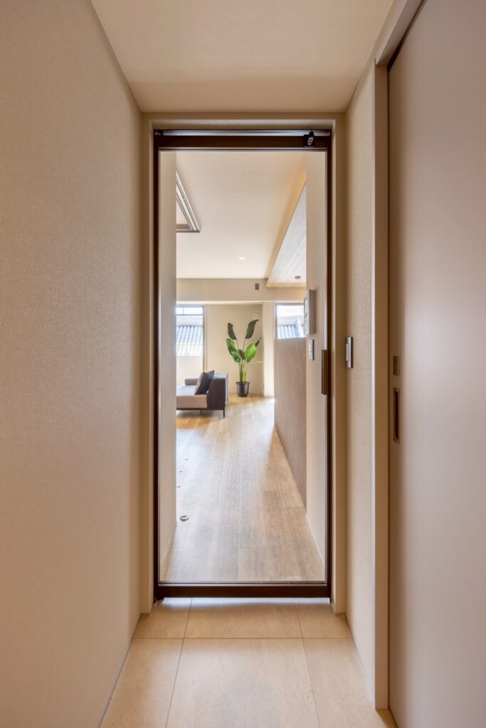 リビング扉には全体のデザインに調和したブロンズ色枠のガラスドアを採用。リビングからのやわらかな光が廊下まで届き、空間全体に広がりと明るさを感じられます。