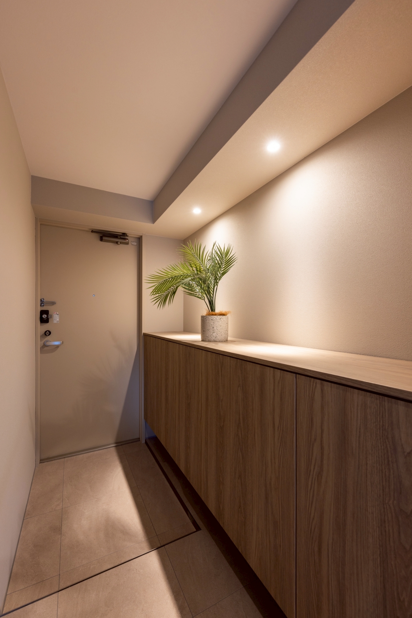 フロートタイプのカウンター下足入れで収納力とデザイン性を両立。集光ダウンライトが玄関を美しく照らし、雰囲気のある空間に。カウンターには絵画や小物を飾り、我が家らしい空間を演出できます。