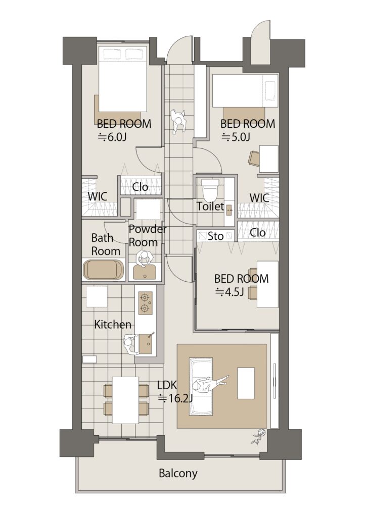 約72㎡の3LDK。2つのウォークインクローゼットや広々としたLDKが魅力の間取です。