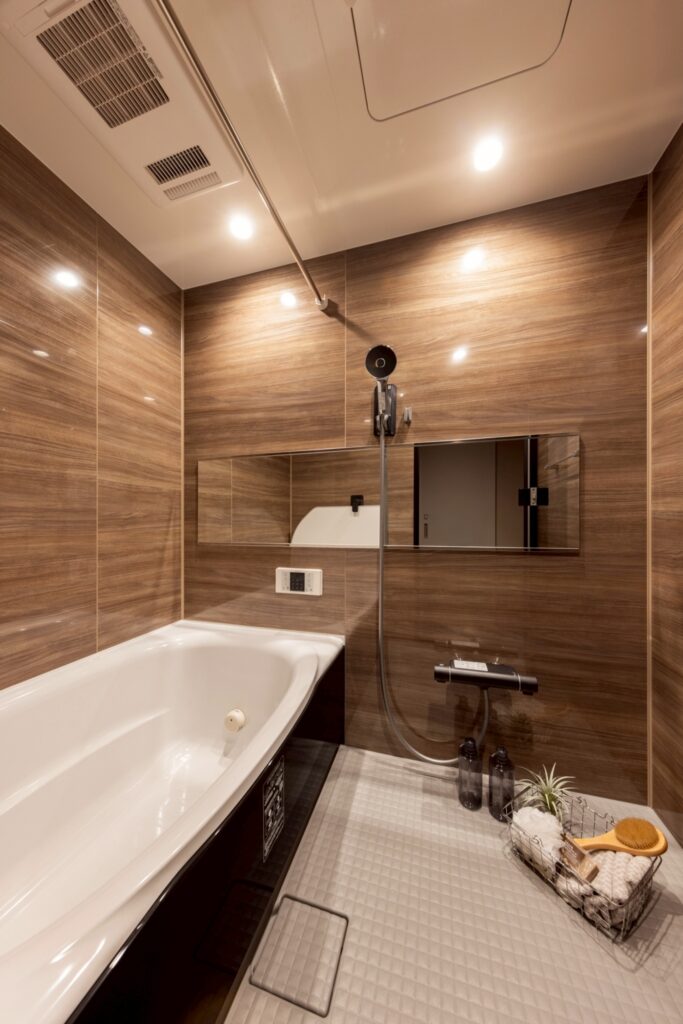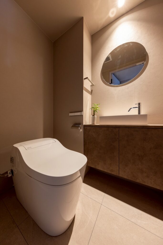 全面に木目調パネルを採用し、ダウンライトがやさしく照らす落ち着いた雰囲気の浴室。上質な空間で、日々の疲れをゆったりと癒やせます。トイレはテラコッタ調の収納付き手洗いカウンターを設けた上質感のある空間。集光タイプのダウンライトが空間をやさしく照らし、落ち着いた雰囲気を演出します。