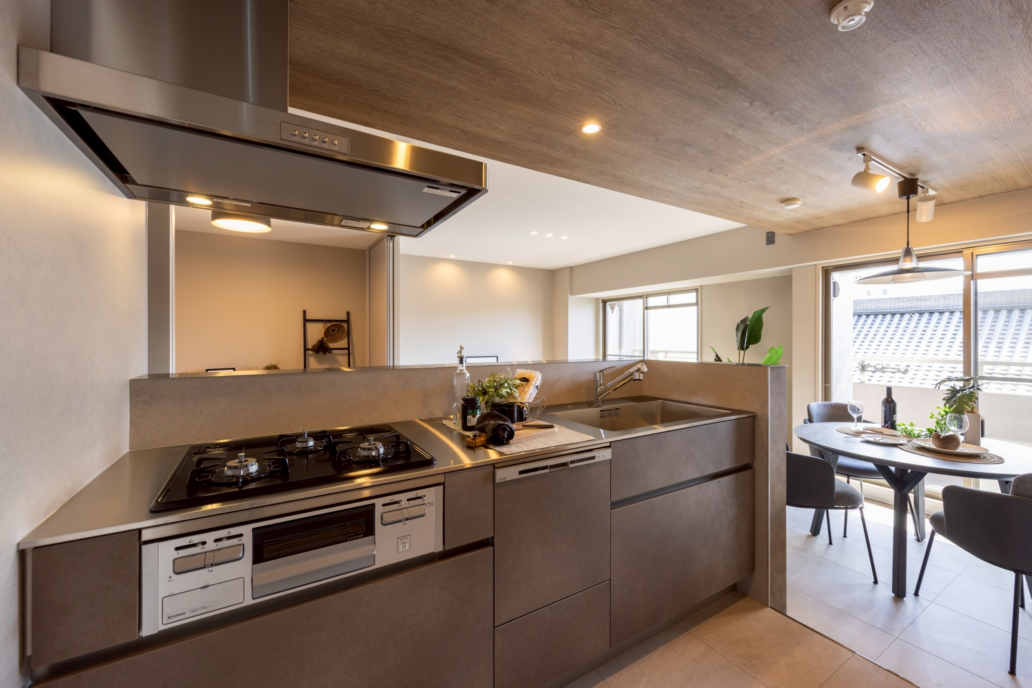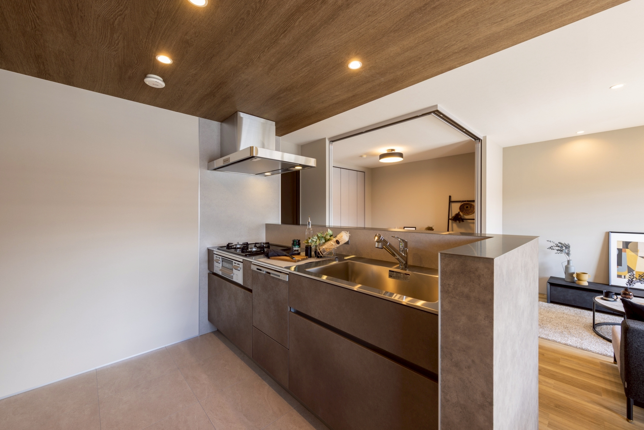 テラコッタ調の造作カウンターと調和するブラウンカラーのキッチン。手元がリビング側から見えにくい設計で、生活感を抑えながらすっきりとした美しい空間を演出します。